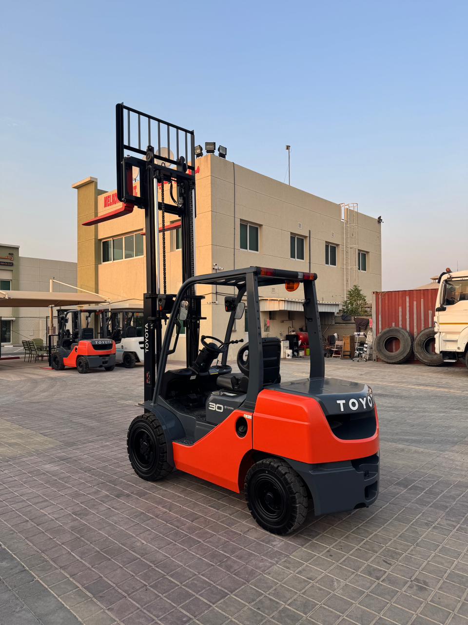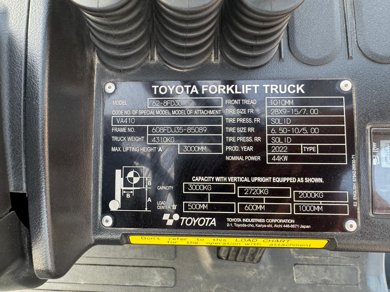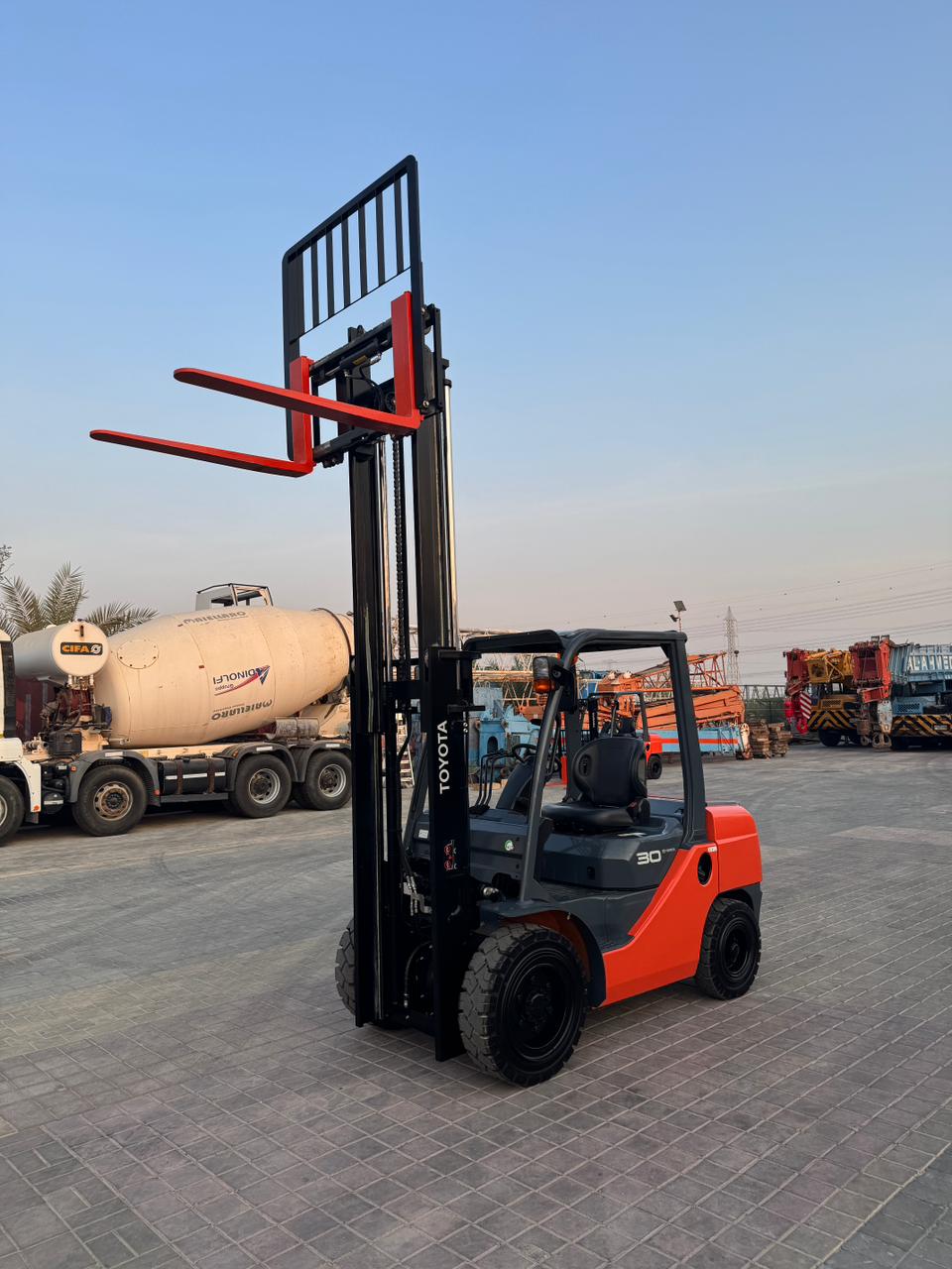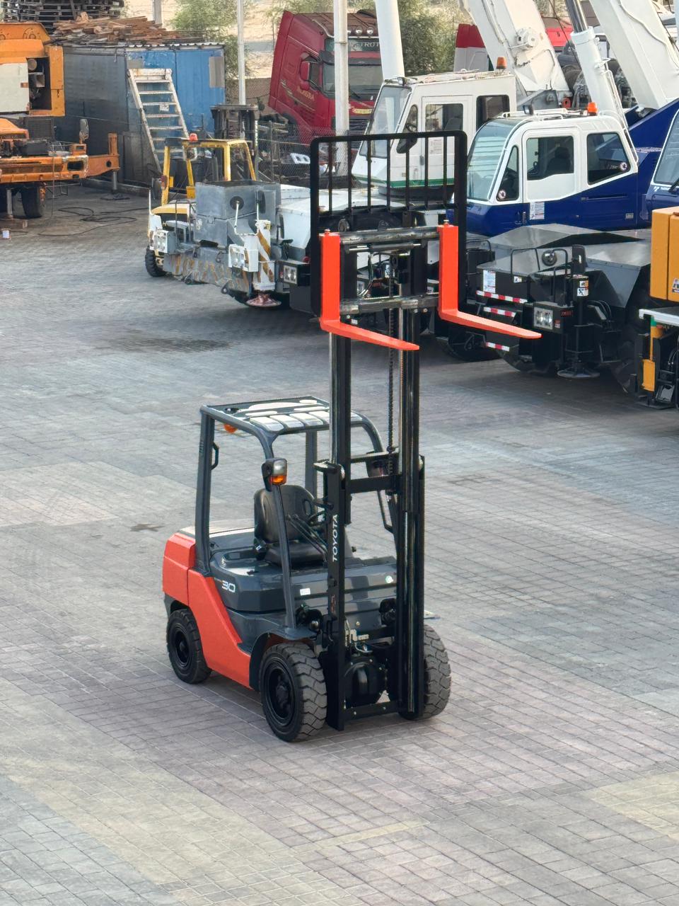 Mast: 2 Stage V Mast Mast Extended Height: 4,220 mm Lift Height: 3,000 mm Overhead Guard Height: 2,180mm Closed Mast Height: 2,120mm Fork Length: 1,070mm Carriage: with side shift Tyre Front: 28 X 9-15 SOLID Tyre Rear: 6.50-10 SOLID